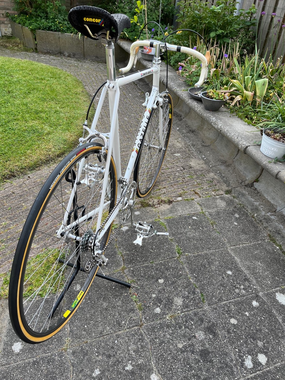 - Wielen: DT-Swiss double butted chroomstalen spaken en Mavic MA40 antracietkleurige draadvelgen, Maillard 700 Sprint pignon 6 vitesses 13-21, Vredestein Fortezza senso Superiore 23 mm draadbanden en Michelin Airstop butyl binnenbanden met 40mm ventiel