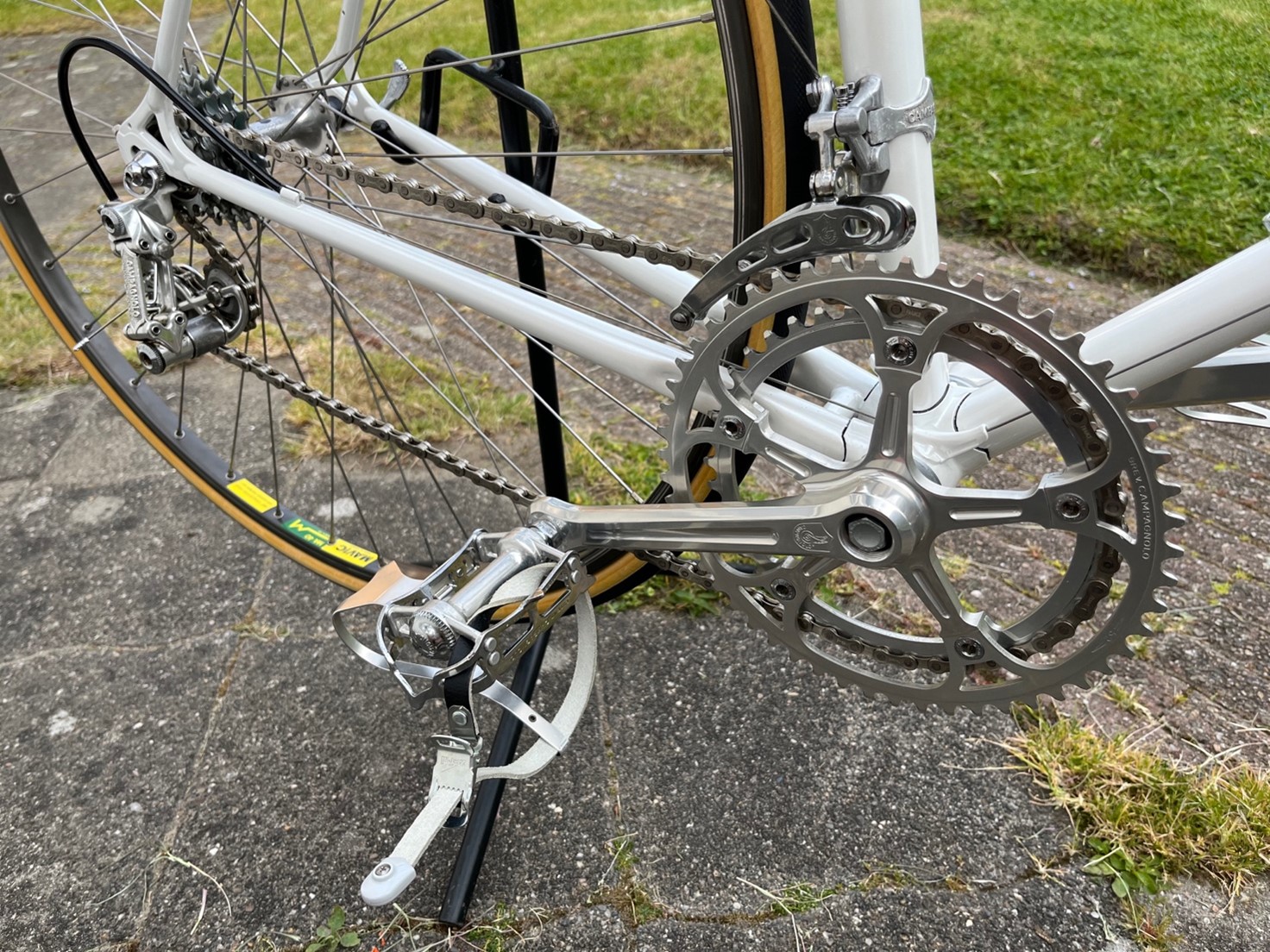 - Pedalen: Campagnolo Record, met originele Campagnolo toeclips (L) en trekdopjes. Zwarte lederen toeclipsriemen.