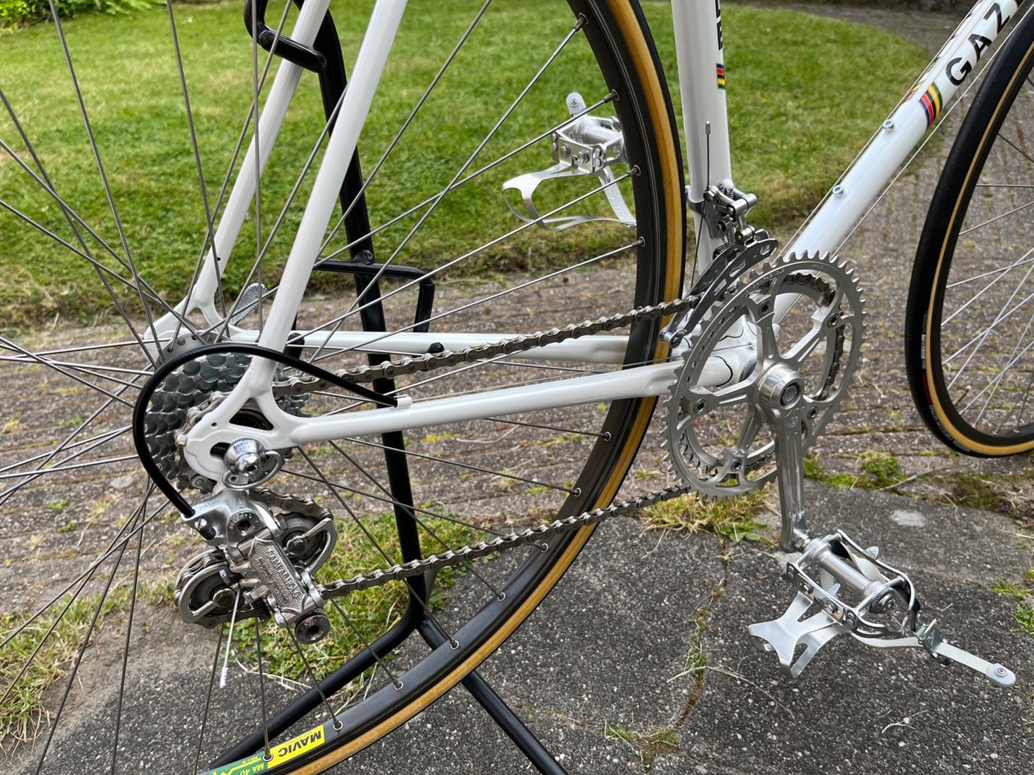 - Versnellingsapparaat: Campagnolo Record, voor en achter, met Simplex commandeurs, Sedis Grand Tourisme GT7 ketting zilver, grijze Tackx derailleurwieltjes voor 5-6-7 speed
